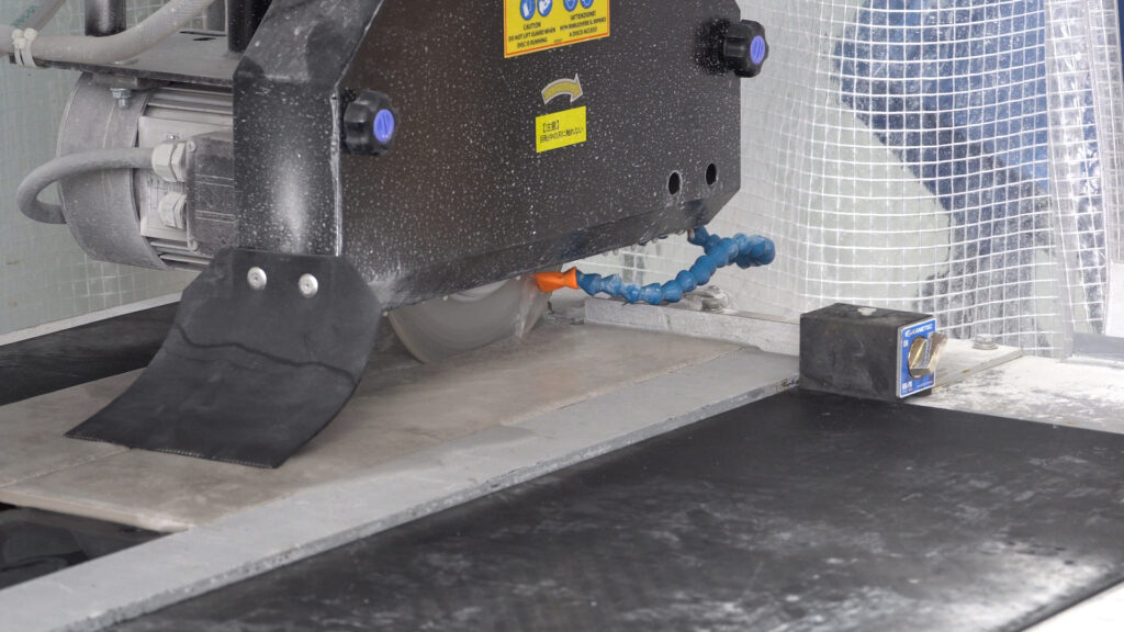 タイル施工の現場で必要となるのがタイルの加工です。施工現場では角の部分や端などの処理に「役物タイル」と呼ばれる特殊な形状のタイルが必要となります。役物タイルの加工には切断機などの設備と工場が必要となるため、今までは、自社での加工が困難で県外の加工業者に製造を依頼していました。加工にはそれ相応の時間も必要となります。内容と量にもよりますが、長いと1週間かかる場合もあります。そのため、どうしてもタイムロスが発生しスケジュールにも影響が出ます。また、例えば、加工した材料がなければ、その部分だけを後日、施工に行かねばならない、いわゆる「出戻り」作業が発生します。次から次へと、職人さんを動かしていく中で、材料がないためにスムーズに行かなくなり、効率が悪くなります。自社でタイル加工ができれば様々なメリットが生まれますし、より臨機応変にスムーズに対応が可能となります。